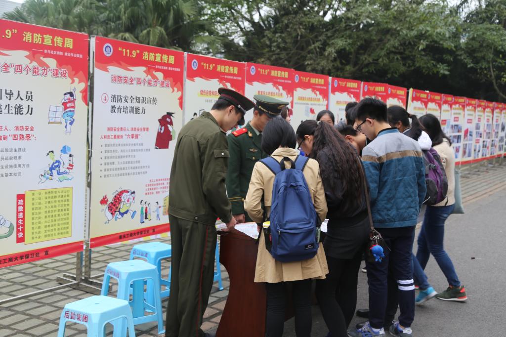 11月9号上午,学校保卫处、南岸区消防支队二塘中队消防员与计信学院员工会的同学一起在学校7教门口摆放学校教室、宿舍、计算机室、实验室等场所的消防知识宣传板报、并且在现场设置咨询答疑台,发放火灾事故预防、火灾事故逃生急救知识等宣传单,为工商师生宣讲消防知识。老师和同学们都主动上前观看展板内容,拿取消防宣传资料来提升自我消防安全意识。